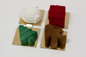 4 kerst desserts, in vorm van igloo, cadeau, kerstboom en koekmannetje